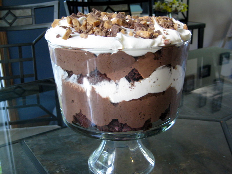 - In a glass punch bowl, layer in the following order: 1/2 of the brownie, crumbled; 1/2 of the pudding; 1 toffee bar, crushed; 1/2 of the whipped topping.