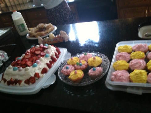 2. My easter treats. I made the pastel cupcakes and of course the angel food cake to the left (that I did not make) totally outdoes mine.