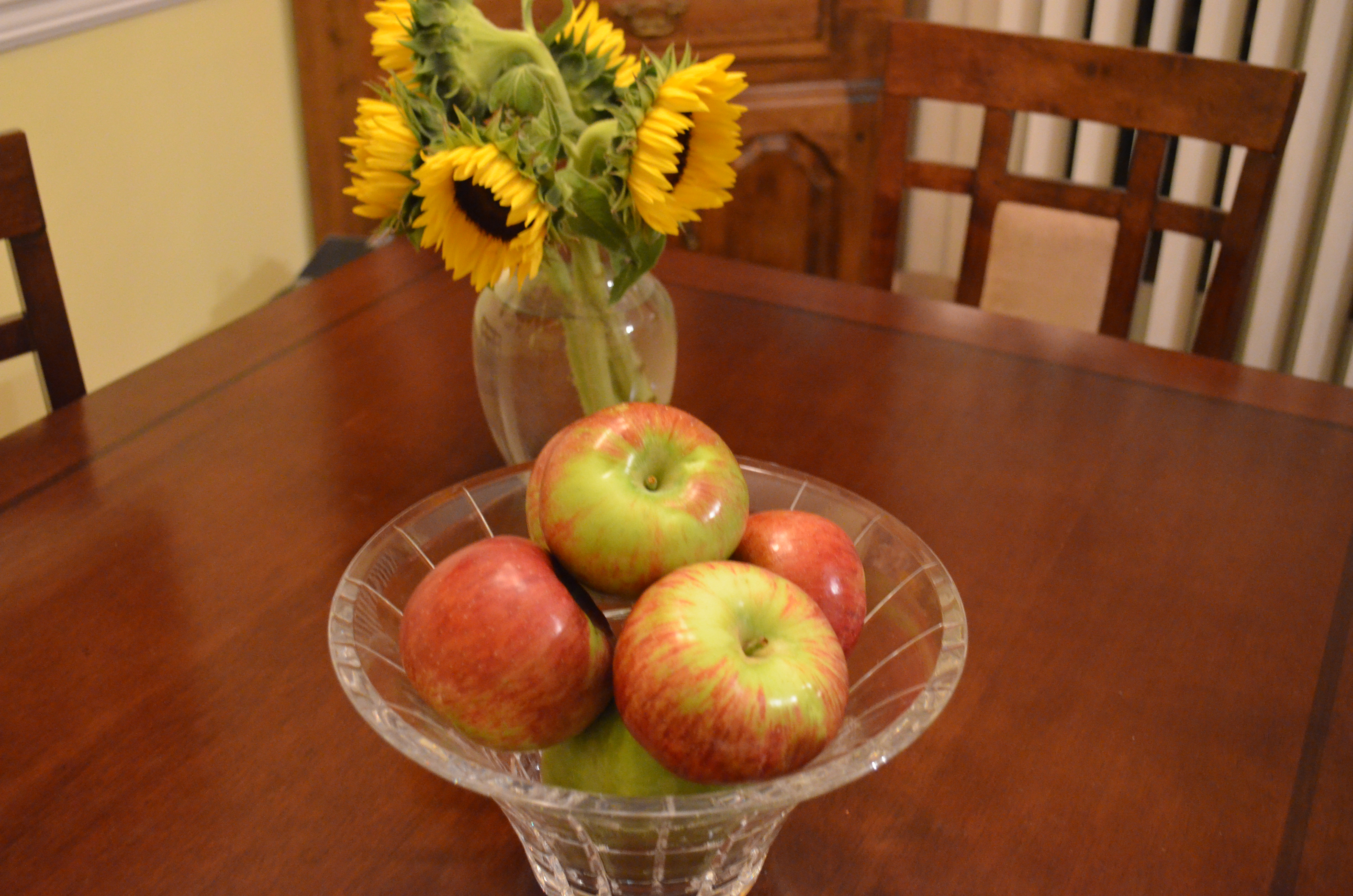 {Bowl of hand picked honey crisp apples and fresh sunflowers}