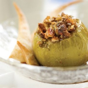 2. Scoop out the core from top of the apple, leaving a well. Do not cut all the way through. Stuff each apple with 2 tablespoons brown sugar, 1 tablespoon butter, and pecans. Place in a shallow baking dish and sprinkle with cinnamon.