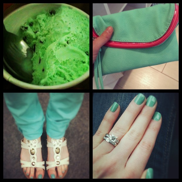 {Mint chocolate chip gelato, Charming Charlie Clutch, Target sandals & Forever 21 jeans, Mermaid Tears manicure by OPI}