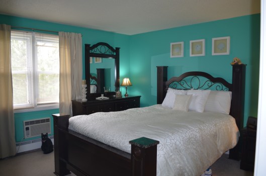 We were a little nervous at first but went for it. The color here is Benjamin Moore Miami Green. Comforter is Martha Stewart Shimmer collection. Oh, & Jingles made it into this picture, this is her fave room because we get a lot of sunlight here. 🙂