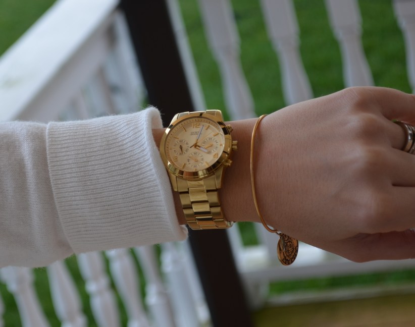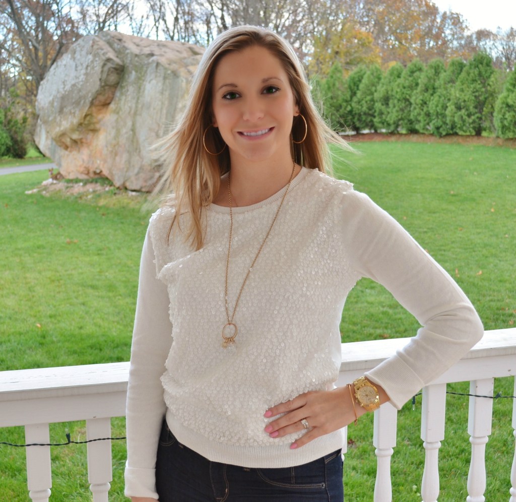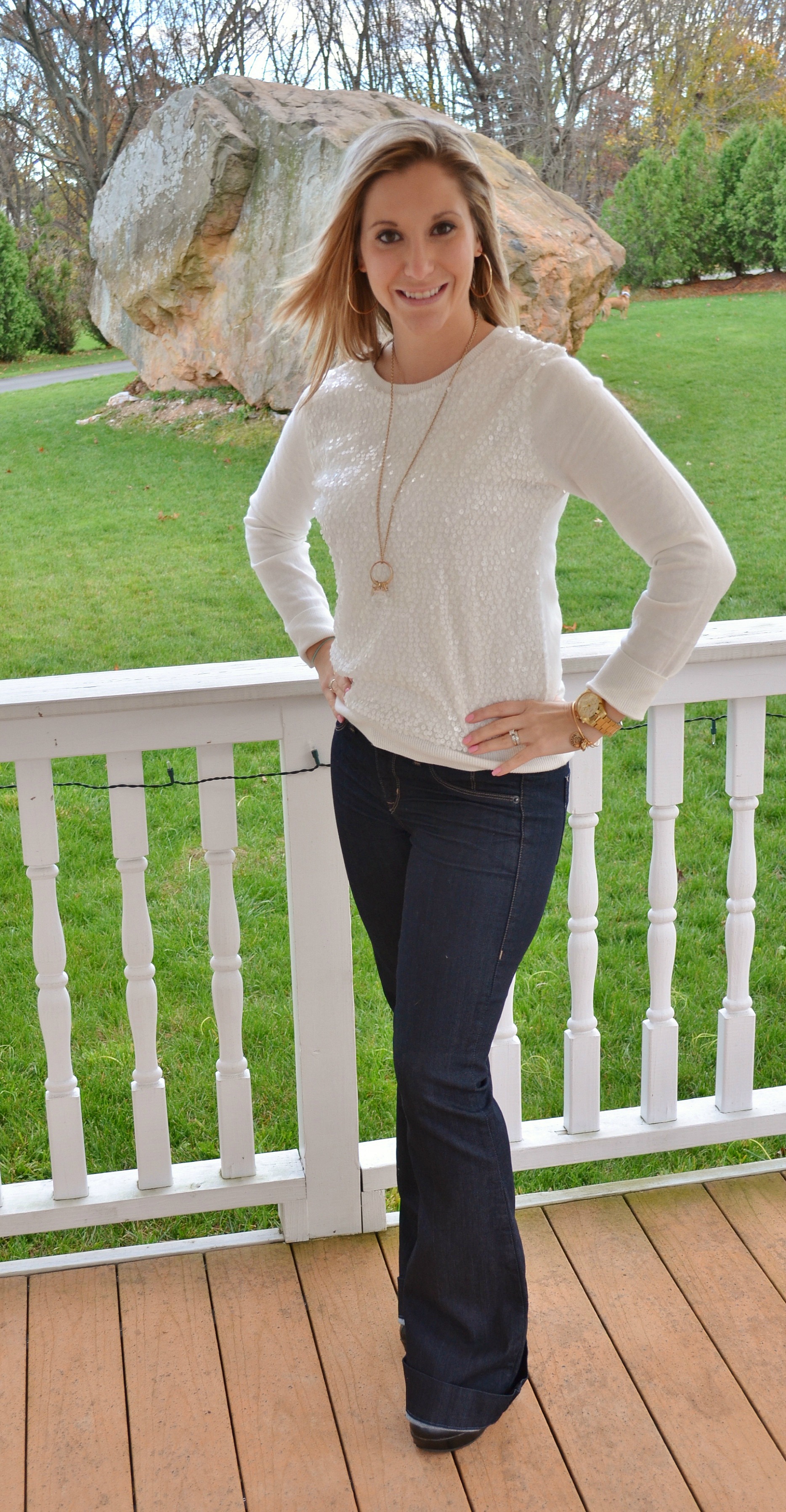 {Sequined sweater: Forever 21| Bootleg jeans: Kenneth Cole| Boyfriend Watch c/o Guess| Alex and Ani Huskies charm bracelet| Diamond chain necklace: Charming Charlie}