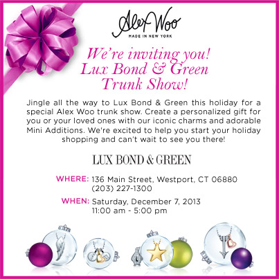 I am excited to personally invite my readers to the Alex Woo trunk show at Lux Bond and Green in Westport, CT. Not only is Alex Woo a Made in the USA Brand, but all pieces are hand crafted in the heart of New York City’s diamond district, something the designer feels truly passionate about. Don’t miss this upcoming trunk show at Lux Bond and Green from 11:00am – 5:00pm on Saturday, December 7.
