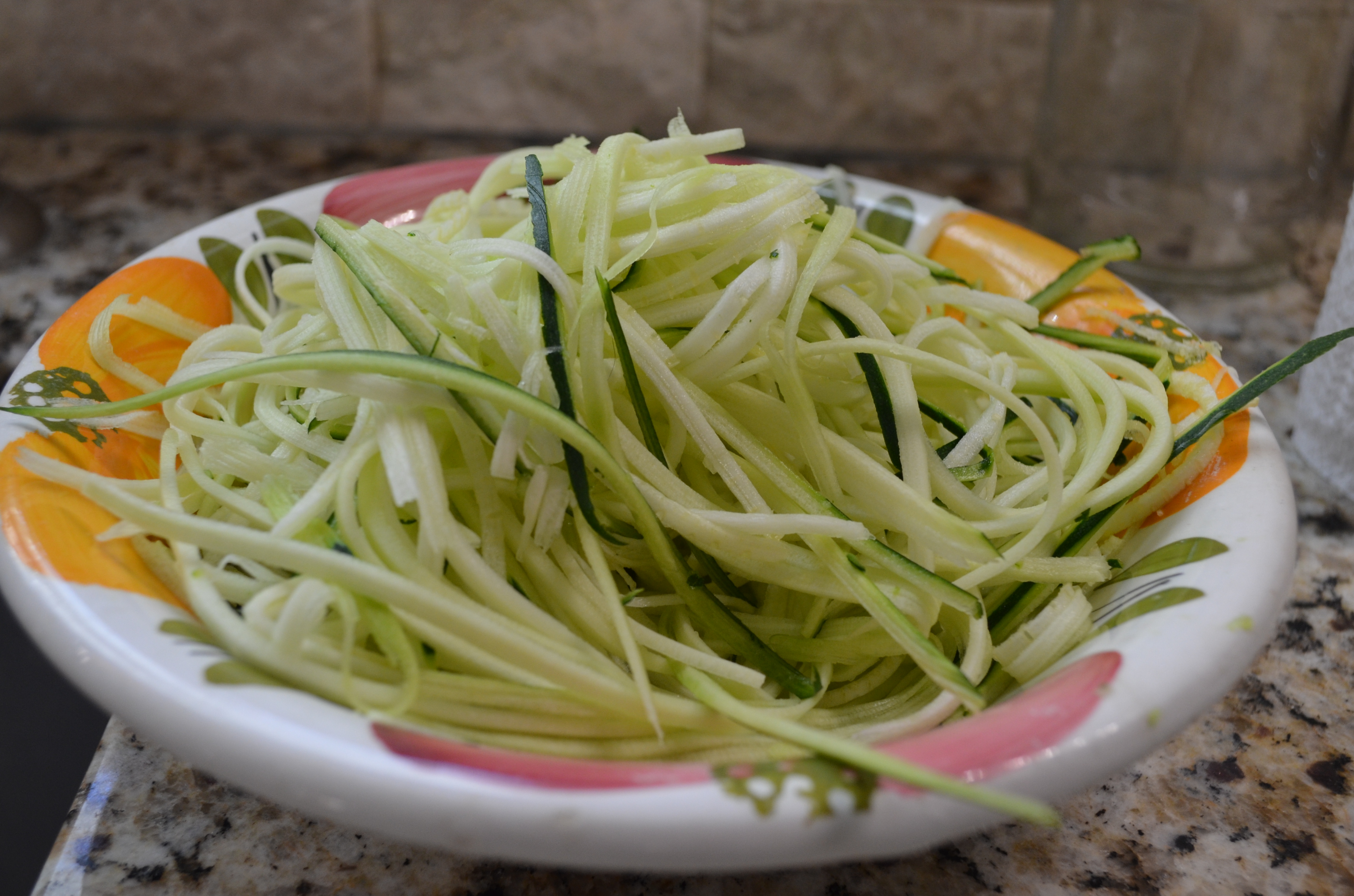 1.Use a julienne peeler, like this one I bought from Amazon, to slice the zucchini into noodles, stopping when you reach the seeds. Set aside.