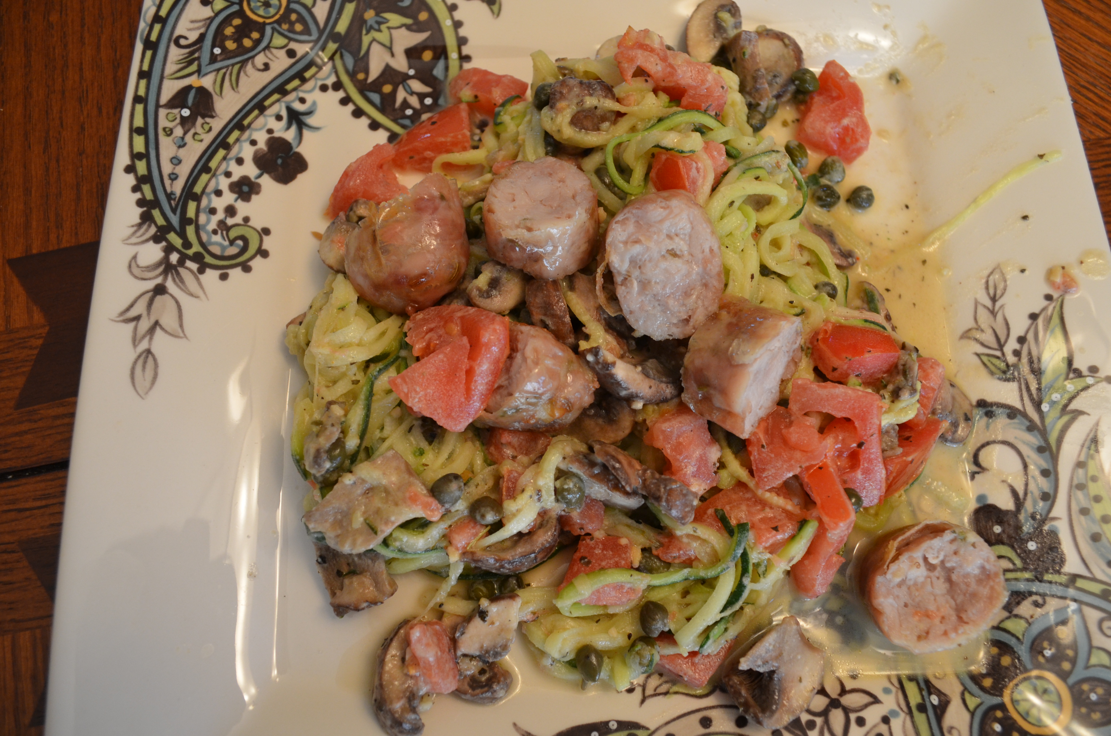 3. Heat a skillet with olive oil. Add Zucchini, capers, tomatos, parmesan cheese, mushroom, chicken sausage and garlic.