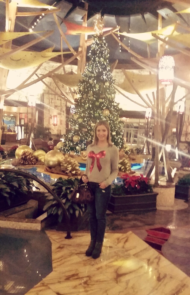 This week was a festive one. I had some vacation from work and headed to Mohegan Sun casino with my Mom, which was beautifully decorated for the holidays.  We also went to the outlets and finished most of our Christmas shopping which is a huge relief! To add some more festivity, I wore my Bethany Mota Aeropastale Bow sweater. My pup, Zoey, also helped me decorate the Christmas tree and I ended the day off with a festive, silvery sparkly manicure.