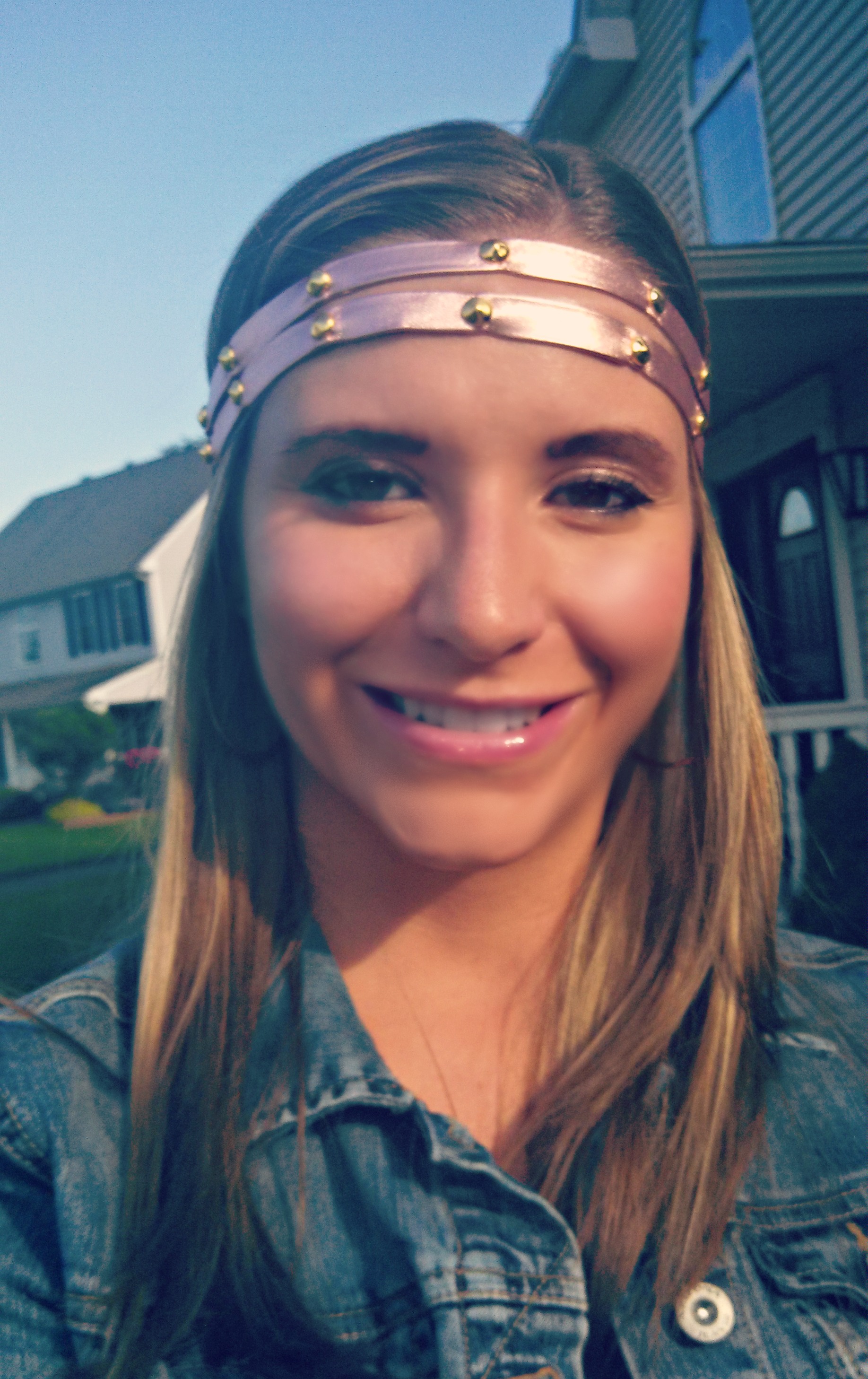 {Striped Maxi: T.J. Maxx (worn here)|Cropped jean jacket: H&M|Jessica Simpson wedges: Nordstrom Rack| Metallic Rose Gold Hair Wrap c/o  Dana-Bands| Gold boyfriend watch: Guess}