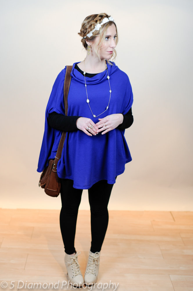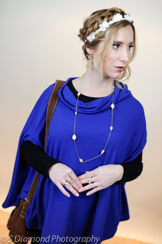 {Royal Blue Poncho c/o Serene Sky Boutique| Arrow Triangle c/o Serene Sky| Moonstone Teardrop Necklace ON SALE | Hair & Makeup: Beauty Entourage| Photo credit: 5 Diamond Photography| Fringe bag: Marshall’s| Lace-up booties: Charlotte Russe}