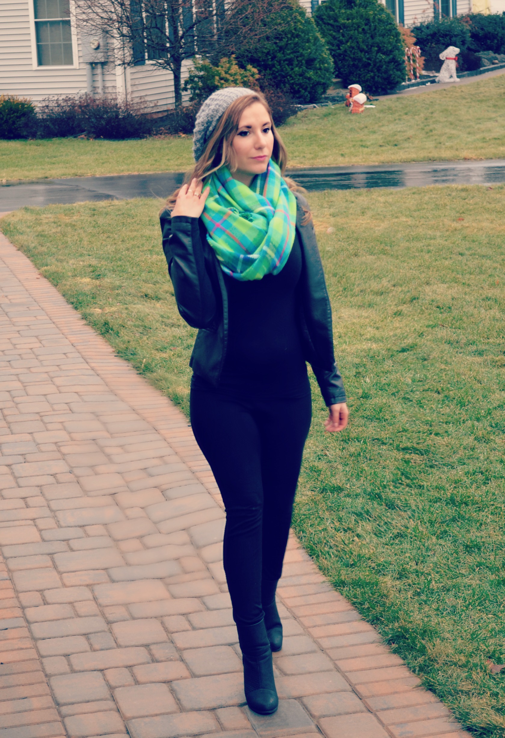 {Gray Maxi dress: Seraphine Maternity| Black faux leather jacket: Express| Arrow triangle earrings c/o Serene Sky Boutique| Name plate necklace c/o Eve’s Addiction}