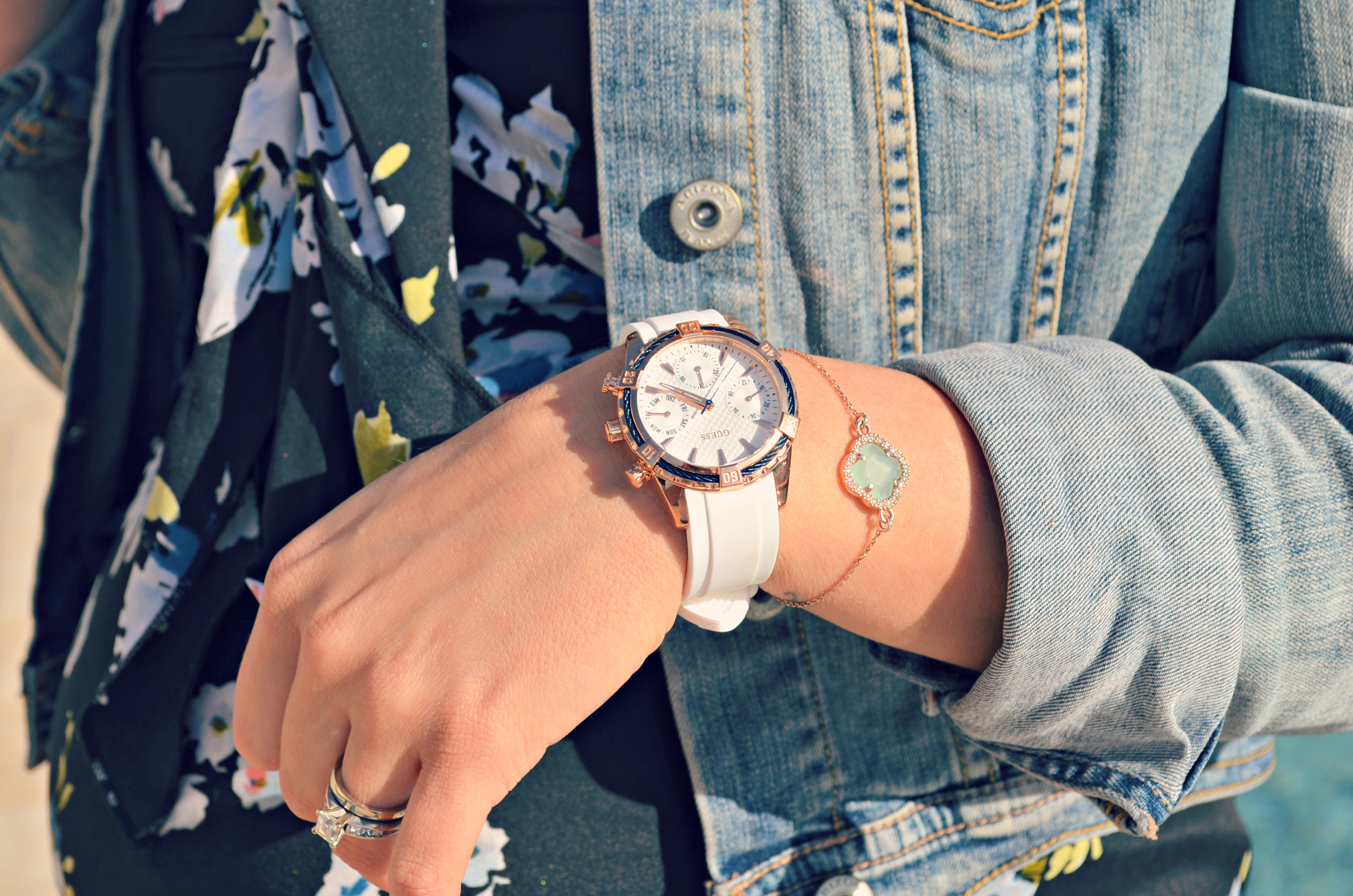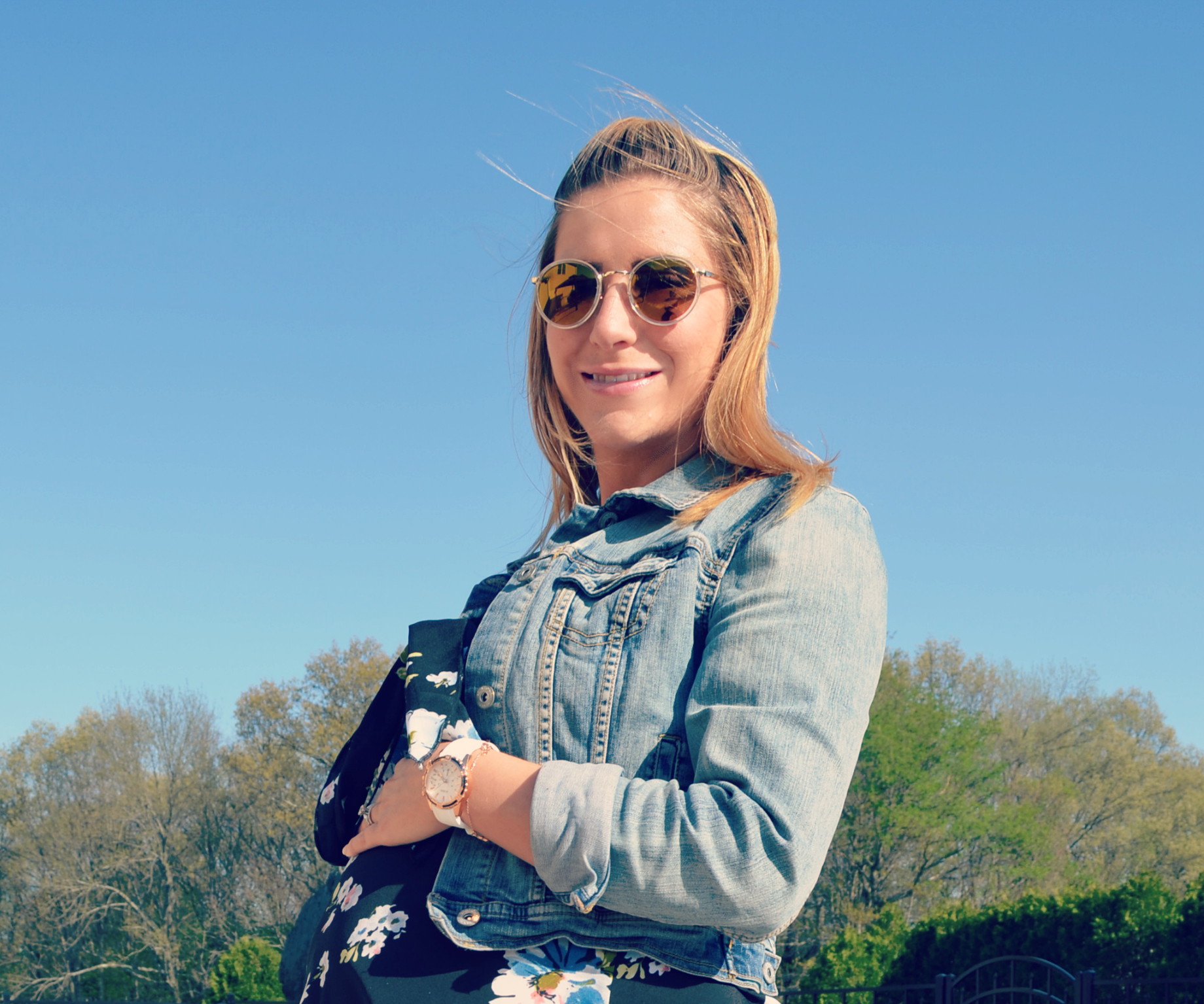{Floral maxi: T.J. Maxx | Coachella sunglasses c/o Polette | Watch c/o Guess | jean jacket: Nordstrom}