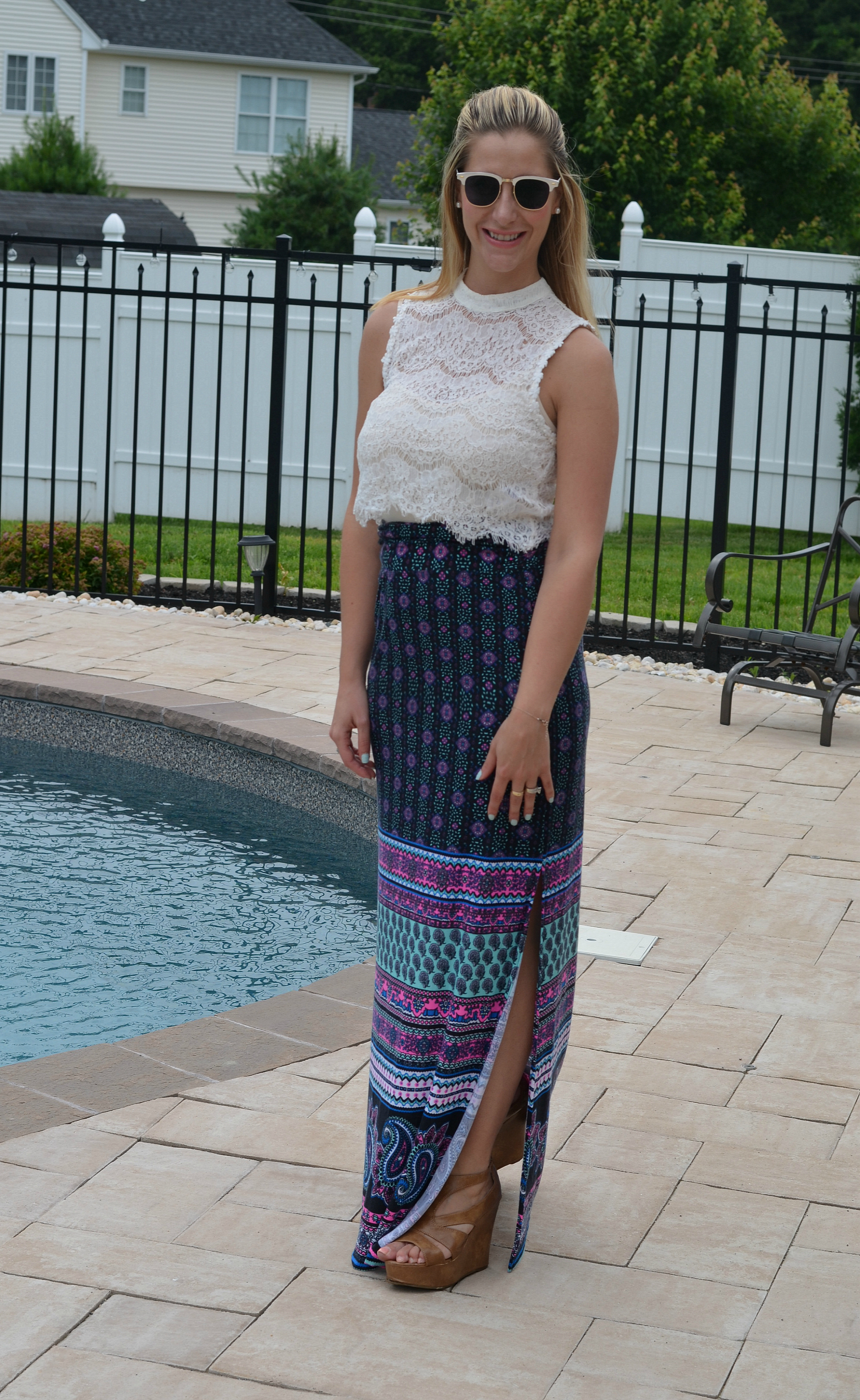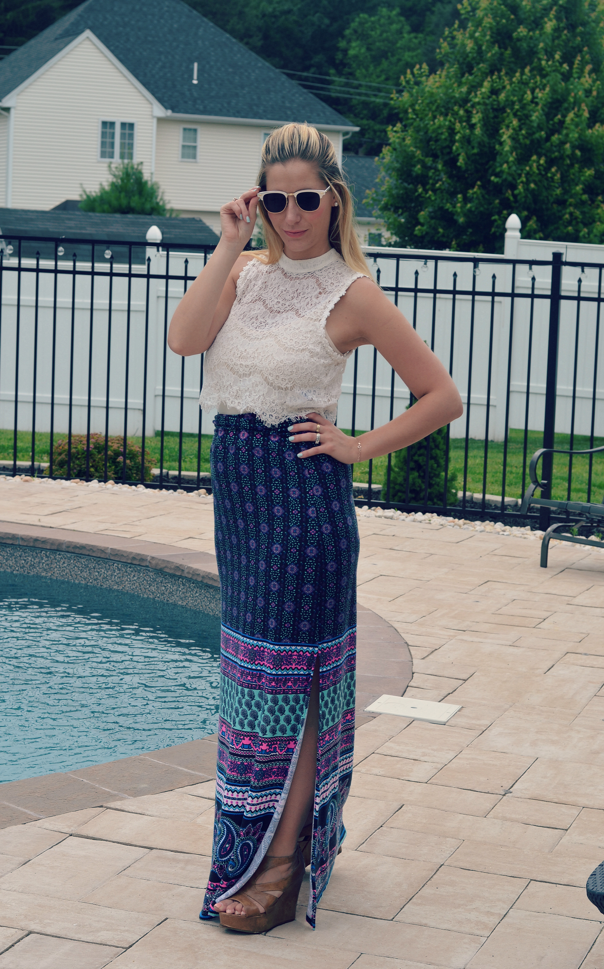 {printed maxi skirt: Macy’s | Rx sunglasses c/o polette | Lace crop top: Forever 21 | Nude wedges: Steve Madden | Freshwater pearl studs c/o Laguna Pearl}